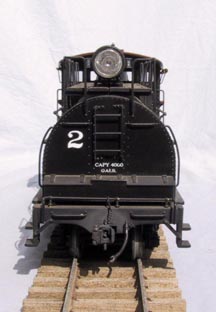 | Big River #2 is inspired by Pacific Coast #110, which ran in central California, near San Luis Obispo. The distinctive whaleback tender was used by Pacific Coast and Carson and Colorado. The model is an extensively modified Bachmann Big Hauler. It it powered by a Pitman motor, driving a Barry's Big Train drive unit. Power is provided by a Makita 9.6 volt battery inserted through the boiler front. The speed controller and radio link are from Reed's in La Mesa, CA. The sound system is by Sierra. The chuff sound is synchronized to the axle. All the electronics are in the tender. |