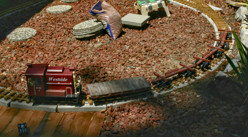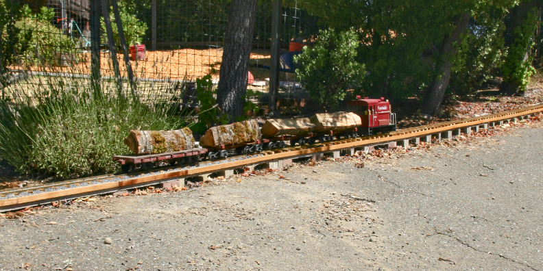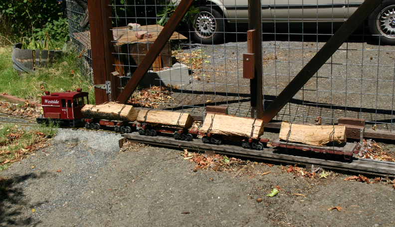 In the summer of 2025, the end of track had reached the front yard at the north side of the house. Even before the north siding had been completed, the WTC shipped four logs, testing the capacity of WTC1 on the 7% westbound ruling grade. One flat car was used in addition to the three skeleton cars, showing proof of concept that the WTC could provide rail service for firewood delivery, a primary industry on the line.