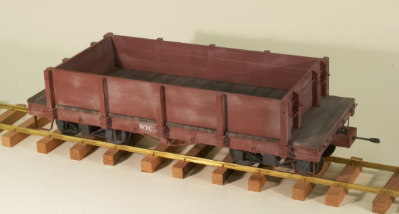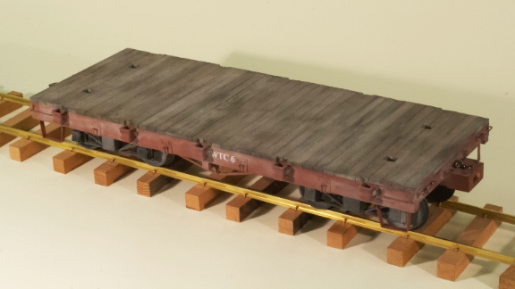 My next project was constructing four flat cars, with one modified as a short-sided gondola. The WTC is an industrial short line, with tight curves, so all the equipment is short as well, in this case 20' long decks. Narrow gauge freight cars are very basic. I used madrone hardwood for the frame, which was glued and pinned together with dowels. The frames are strengthened with four truss rods, and a single queen post beam in the middle of the car. This picture shows the bottom side of the frame before truss rods are added. The sides of the frame parts have been painted before stake pockets have been installed.