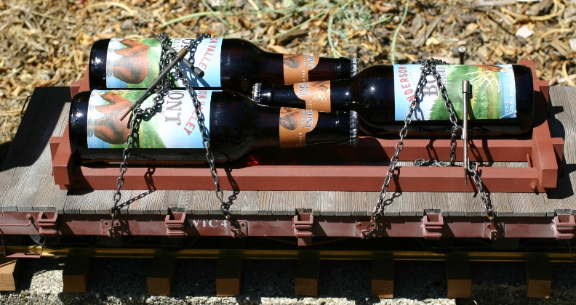 Here is the finished car. Corner steps and side and end grab irons have been installed, and the entire frame has been painted before the deck was added. The deck boards are old growth redwood, with the grain enhanced using a fine wire brush on each board. The deck boards have been "aged" before being glued to the frame. Custom decals were applied, and the entire car weathered.