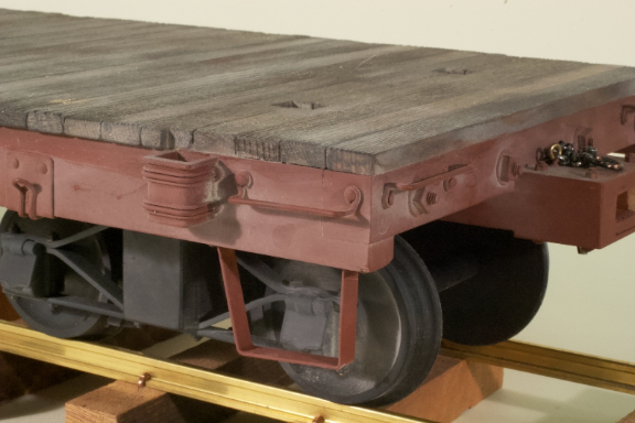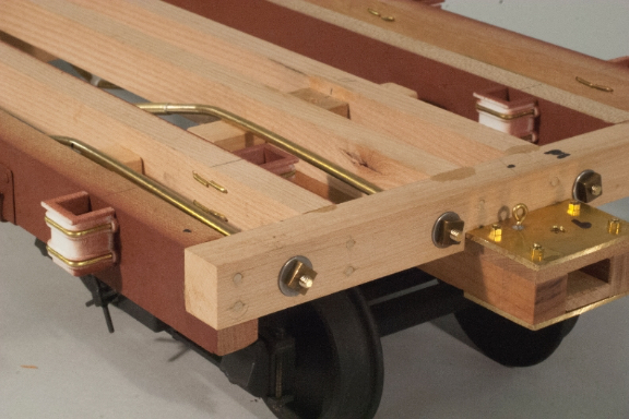 This photo shows a frame mounted on trucks with truss rods installed. A loop has been soldered to the top plate of the coupler pocket for the coupler pin chain.