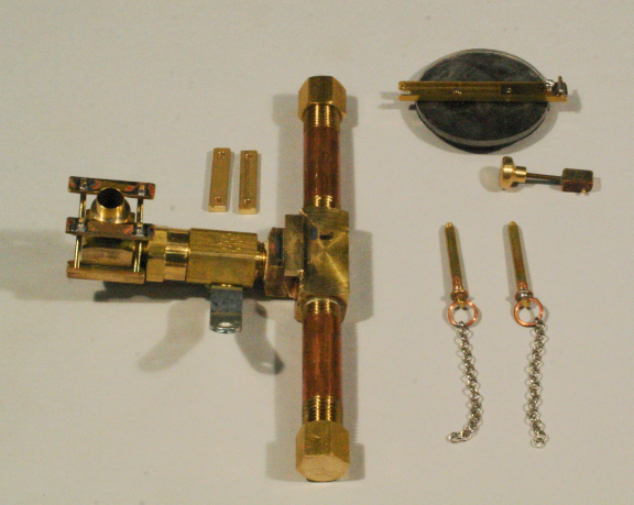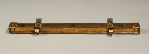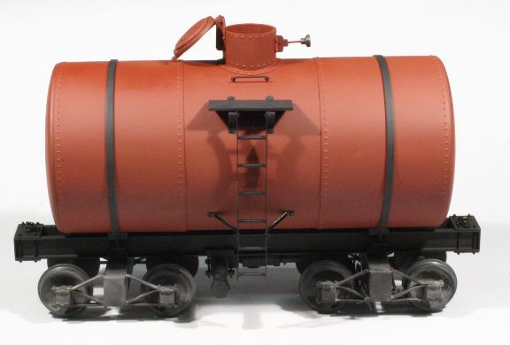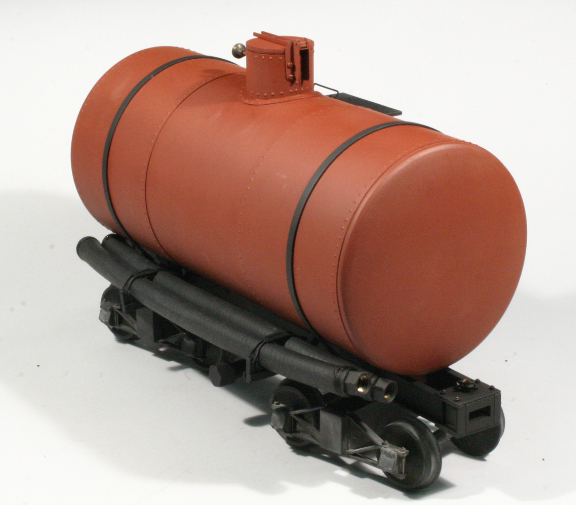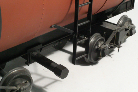 These tank cars have a "steel" spine for the frame. This is built up using brass bar stock, soldered together, with additional parts fabricated, and bolted to the frame, for mounting the tank and the trucks. The tank is secured to the frame with two bands. The end of the frame creates the coupler pocket.