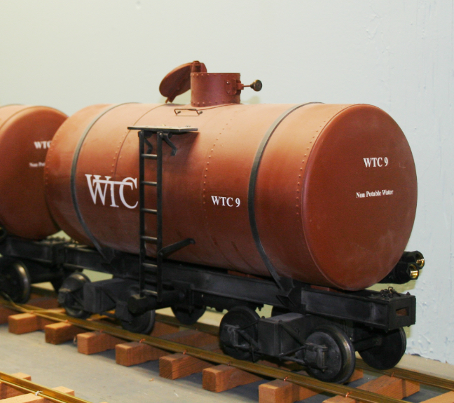 The tank drains through a shutoff valve, with pipes splitting to each side of the tank car, allowing water to be distributed from either side of the car.