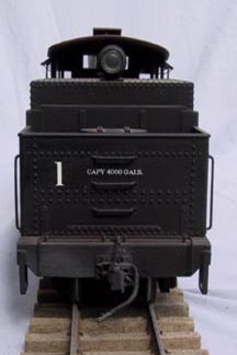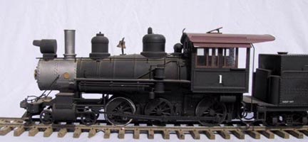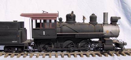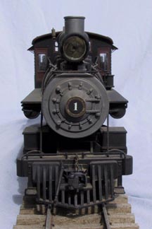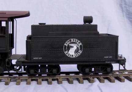 | Big River #1 is inspired by Southern Pacific #16 on the Carson and Colorado, which ran in eastern California's Owens valley. The model is an extensively modified Bachmann Big Hauler. It it powered by a coreless motor, driving a Northwest Shortline worm drive. Power is provided by a Makita 9.6 volt battery inserted through the boiler front. The speed controller is by Remote Control Systems, and the radio link is Futaba. A chuff sound, synchronized to the axle, is produced by modified Bachmann electronics. All the electronics are in the tender. |