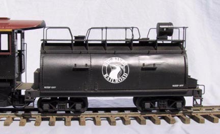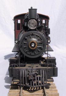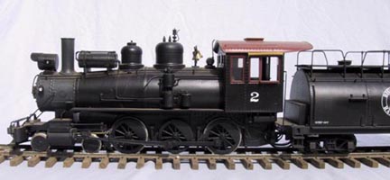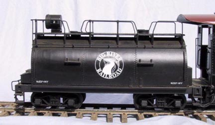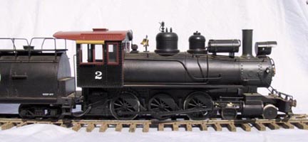 | Big River #2 is inspired by Pacific Coast #110, which ran in central California, near San Luis Obispo. The distinctive whaleback tender was used by Pacific Coast and Carson and Colorado. The model is an extensively modified Bachmann Big Hauler. It it powered by a Pitman motor, driving a Barry's Big Train drive unit. Power is provided by a Makita 9.6 volt battery inserted through the boiler front. The speed controller and radio link are from Reed's in La Mesa, CA. The sound system is by Sierra. The chuff sound is synchronized to the axle. All the electronics are in the tender. |