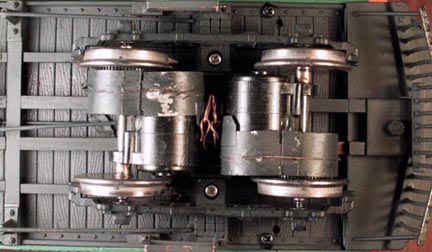 One of the design considerations was maintenance. The copper wires showing in the middle of the underside of the truck secure the tab on each powered axle, preventing it from rotating. I can undo the wires, and fold the axles apart to get to the wiring, if I need to disassemble the truck.