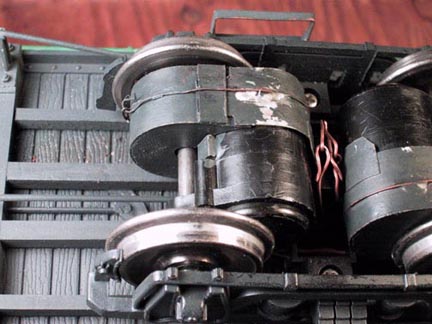 I originally planned to run this car on a Makita 9.6 volt nicad battery. That is the system I use for my 4-6-0's and it's easy to change batteries. However, even the fastest gearing from NWSL was WAY too slow. I changed to two 6 volt gell. Even at the higher voltage, maximum speed is about 25 mph, which is acceptable. The NWSL literature warns that running the motor over 18 volts will shorten it's life. These are nominally 12 volt motors, so you want to wire them in parallel, for best operation.