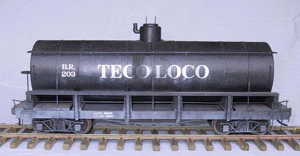 Tank cars 200 thru 205 are inspired by cars from the Pacific Coast Railroad. TECOLOCO is the Tecolote Oil Company, which owns the fleet of cars, but Big River operates them. |