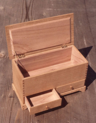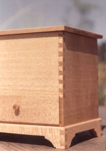 | In July of 1980, I built 12 of these chests. The case is made of Madrone, and lined with Incense Cedar, so they smell wonderful when opened. This is called a "six board chest" because the basic box is made of six boards, dovetailed at the corners. These dovetails are hand cut. This is a fancy chest, since it has two drawers in the bottom. Eventually, chests became "chests of drawers", with no lid or top storage area. |