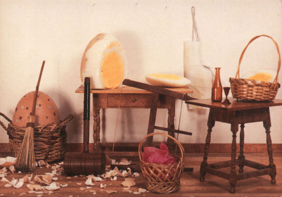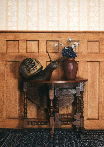 When the economy dried up for this kind of item, I did a couple of craft shows, to see if I could market directly to people. Since most of my pieces were fairly expensive, I produced a couple of postcards, using my miniatures, to have an affordable product to sell. It didn't really work. The first card was the snail on the table, and people thought that it was a model of a snail. In fact, it was a real snail, and everything else was a model. I guess my humor is too strange for the mainstream. |