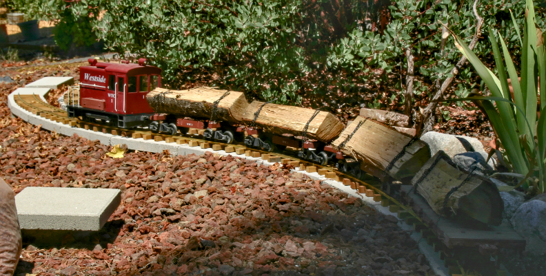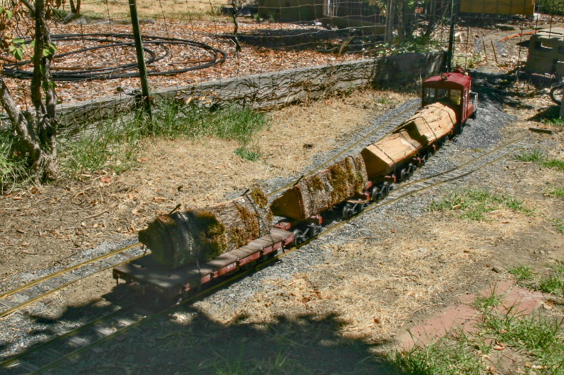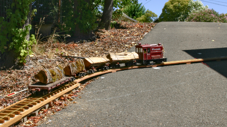 In the summer of 2025, the end of track had reached the front yard at the north side of the house. Even before the north siding had been completed, the WTC shipped four logs, testing the capacity of WTC1 on the 7% westbound ruling grade. One flat car was used in addition to the three skeleton cars, showing proof of concept that the WTC could provide rail service for firewood delivery, a primary industry on the line.