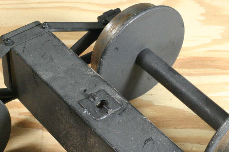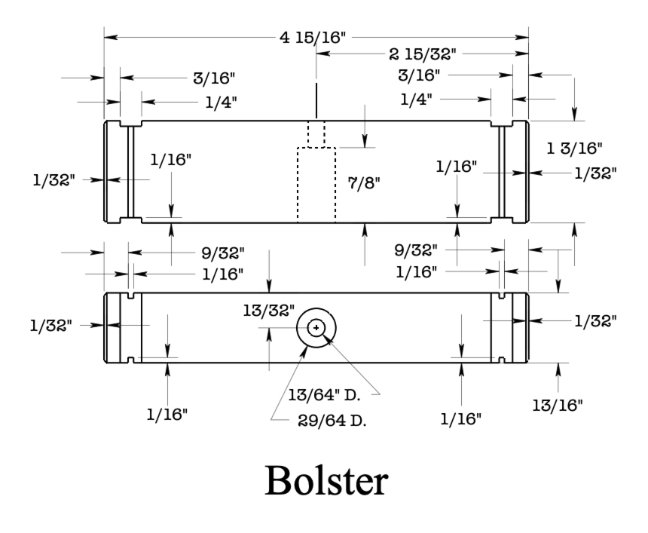 Here are the dimensions for the wooden bolster. The notches top and bottom, near each end, hold the frame bars, and the side notches hold threaded rods.