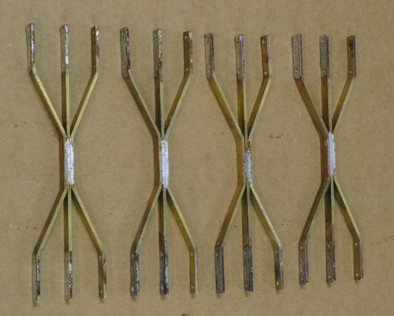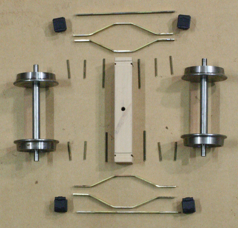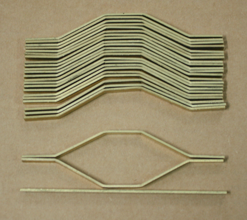 Here we see all the bent bars necessary for three pairs of trucks. At the bottom a pair of bent bars and a straight bar show the arrangement as they will be in the finished truck.