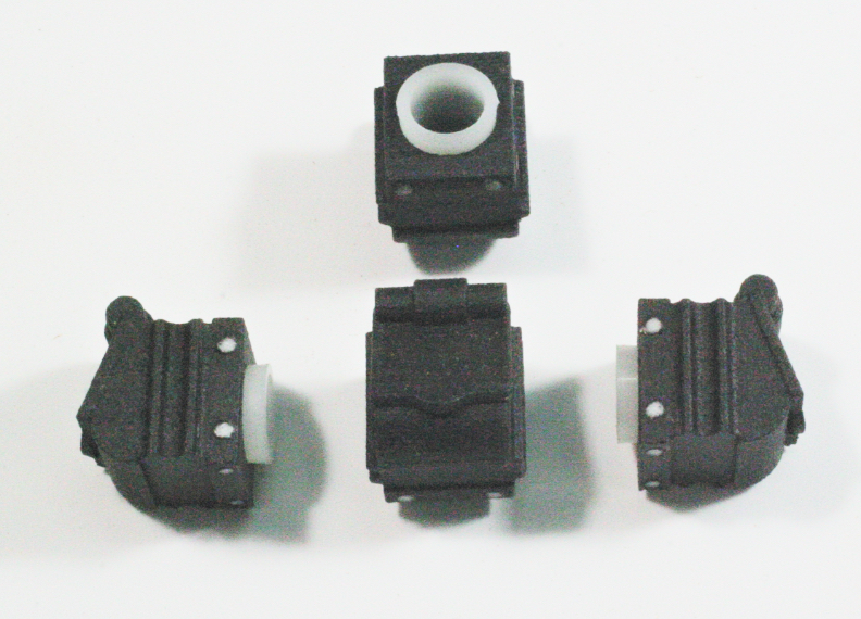 The nylon journal boxes are printed for me by Shapeways, with a black finish. Delrin inserts from McMaster Carr have been inserted.