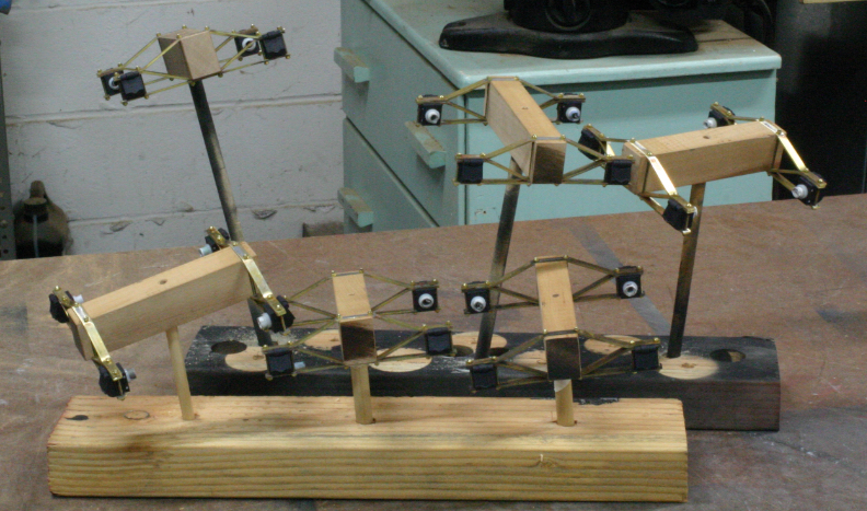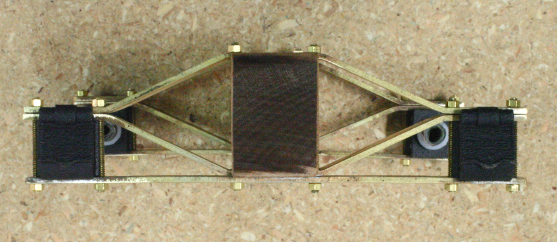 Here is an assembled frame, minus the axles, using 24 brass 2-56 nuts. Small rolls of newspaper have been inserted into the Delrin bearing to keep paint out. This is now ready for painting.