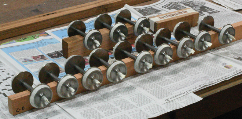 Before being spray painted with flat black primer, the ends of the axles are masked off to keep paint off the bearing surfaces for smooth rolling. The wheel treads are masked as well. All the axles are ready for painting.