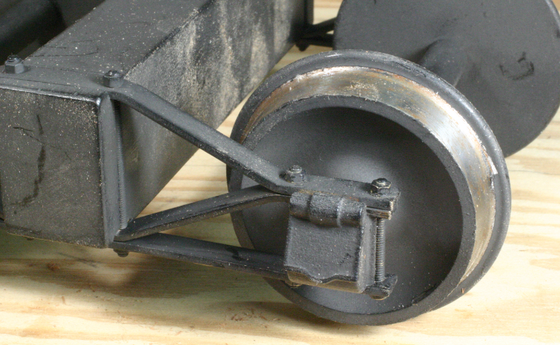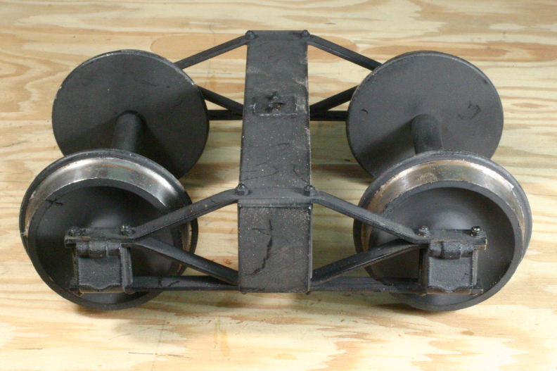 After painting, the masking tape is removed, and a pair of axles is installed into each frame. Here is the side view of a finished truck, ready to mounted on a freight car body.