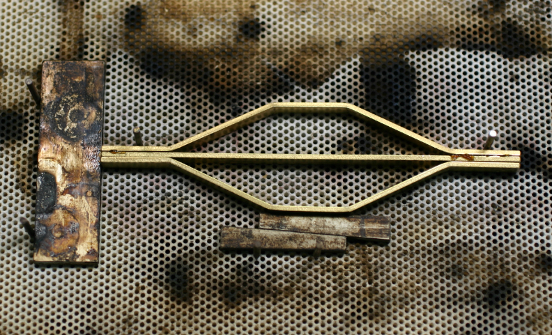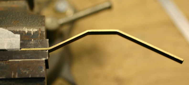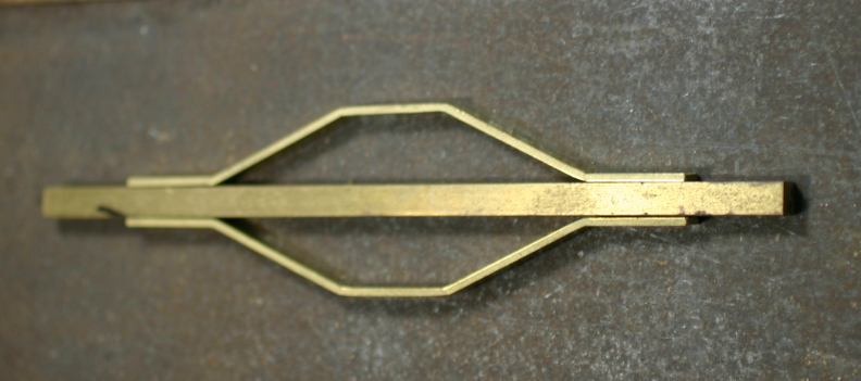 Each pair of bent bars are adjusted for final shape, using a piece of 1/4" x 1/4" brass bar. Each end must lay flush to the central bar, and must be the correct displacement from the central bar in the middle.