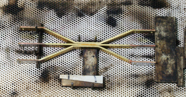 The three bars in a set are kept together for the rest of the fabrication process, and marked to preserve consistent orientation. After the first holes are drilled, the set is reheated, and the bars rearranged in a different jig orientation, to have the center pair of holes drilled. A piece of threaded rod (at the left) keeps the pieces in alignment, ready to be soldered. The end holes are visible.