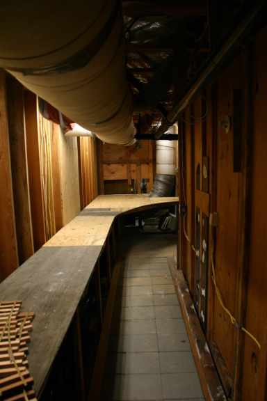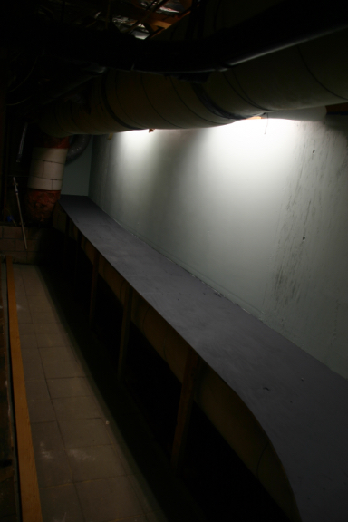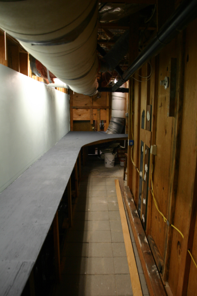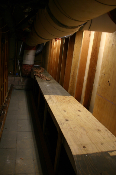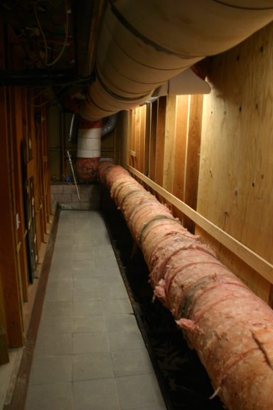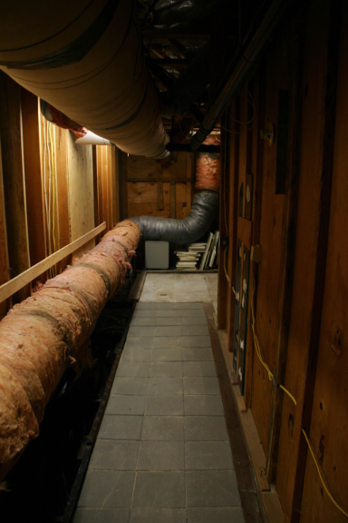 Fortunately, we have a lot of underutilized space. However, the first order of business was to clear out a lot of junk and unneeded construction. This involved tearing out an unused half bath, which was never connected into the city sewer system. After removing everything, I laid paver slabs to cover the raw dirt areas, and added lighting. This left the two main house heating ducts.