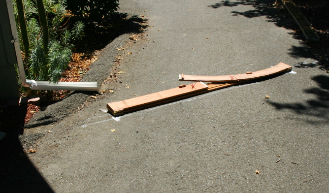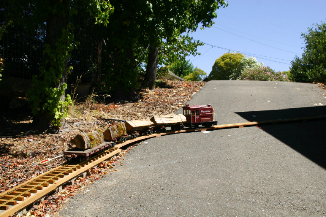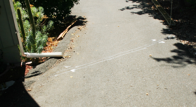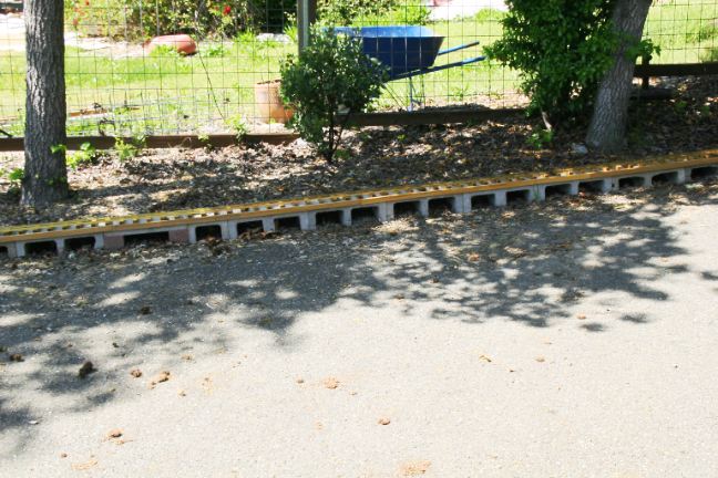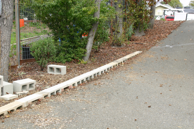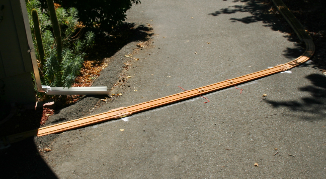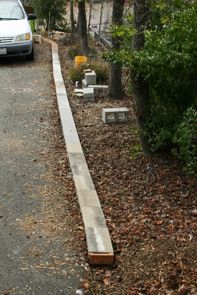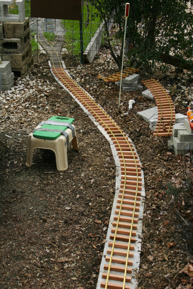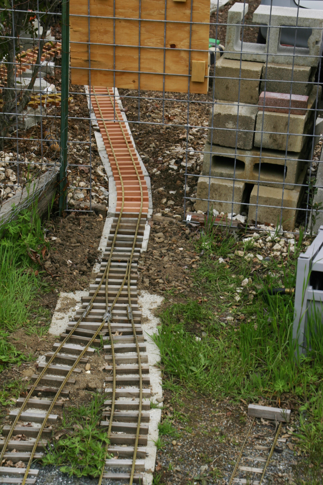 After surveying the property from the backyard to the front yard, I realized I could make the grade a 7% climb, which is now the ruling westbound grade. The eastbound grade, climbing into the basement storage yard, is 10%. Loads will usually leave downhill from the storage yard. To make sure the final grade would be uniform, I start construction from the top. The track needed to cross from the western edge the driveway into the front yard. In my last railroad, built in San Diego, I also crossed the driveway, casting the track into the concrete driveway, but there the driveway was almost level. This time, the driveway is at a fairly steep angle, and there was no clear way to cast track into place. I decided to build a removable bridge. This could be lighter construction, since cars will never use the driveway when the bridge is in place. Once the bridge was fabricated, and the proper location marked on the driveway, I was able to establish the upper end of the roadbed along the edge of the driveway. I used a sting to determine that a 7% grade would indeed be sufficient, and began laying concrete blocks. Here is the roadbed looking downhill from the top. A bridge location pocket can be seen at the very bottom of the picture.