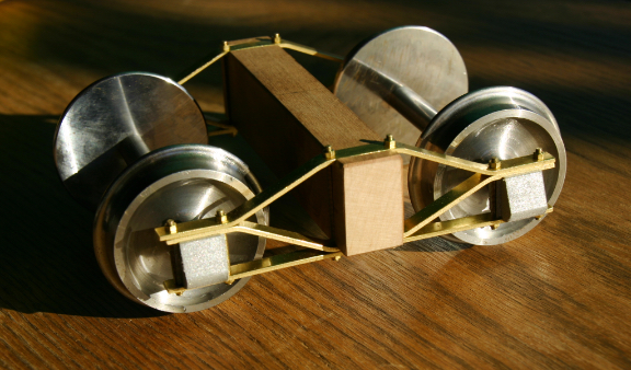 The first design issue was freight trucks. I had the axles, but needed to settle on a standard truck design: a basic arch bar truck. I use 1/16" x 1/4" brass bar stock for the side frames, wood for the main beam, and 3D printed journal boxes, all bolted together with 2-56 nuts and threaded rod. The journal boxes have Delrin sleeve bearing inserts for good wear resistance. I decided that I wouldn't worry about springs, since the Big River ran well with rigid frames. However, I may eventually add working hand brakes to each truck so that cars can be set out without rolling away.