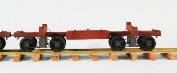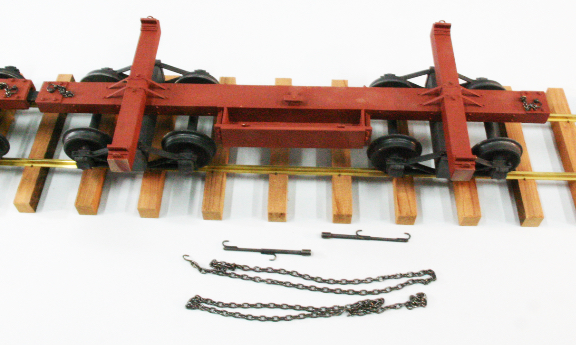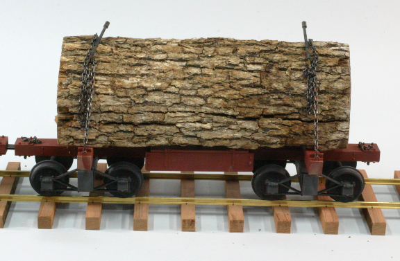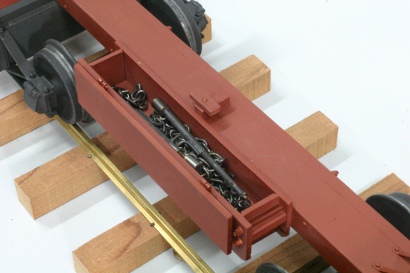 I also needed strong scale chain for the task and a way to tighten the chains onto the logs. I bought brass, hard soldered, chain from an English model boat supplier, and fabricated chain binders from brass tube and 2-56 threaded rod. I added a box to each car, which holds the chains and binders. It is very easy to place a log on the car, and then chain it down securely.