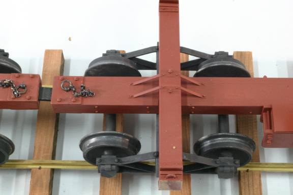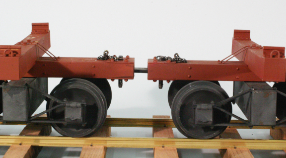 I made the coupler pocket generous enough that these cars can easily traverse a 5' radius curve. At first, the link was a piece of 1/8" x 1/2" brass bar stock. I found I needed more curve clearance, and have now changed the center of the links to a rod. For pins I use commercial pull pins, secured to the cars by short pieces of chain. Metal plates above and below the wooden pocket are secured with 2-56 threaded rod and nuts to transfer the load from the pin to the spine of the car.