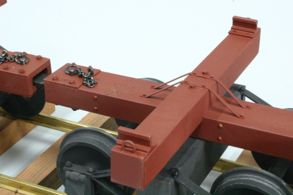 To secure real logs, I needed to make the hook assembly at the end of each log bunk robust and well anchored. Looking at pictures of skeleton cars showed a variety of ways the log bunks were attached to the spine. Throughout the construction, I used nails or bolts to connect parts, which makes the model more of a miniature of the actual log car, and insure long lasting operation. The log bunk ends are brass channel, nailed to the arm, with a chain anchor loop soldered to the inside of the channel. The piece of rail soldered to the channel, protects the anchor loop for log damage.